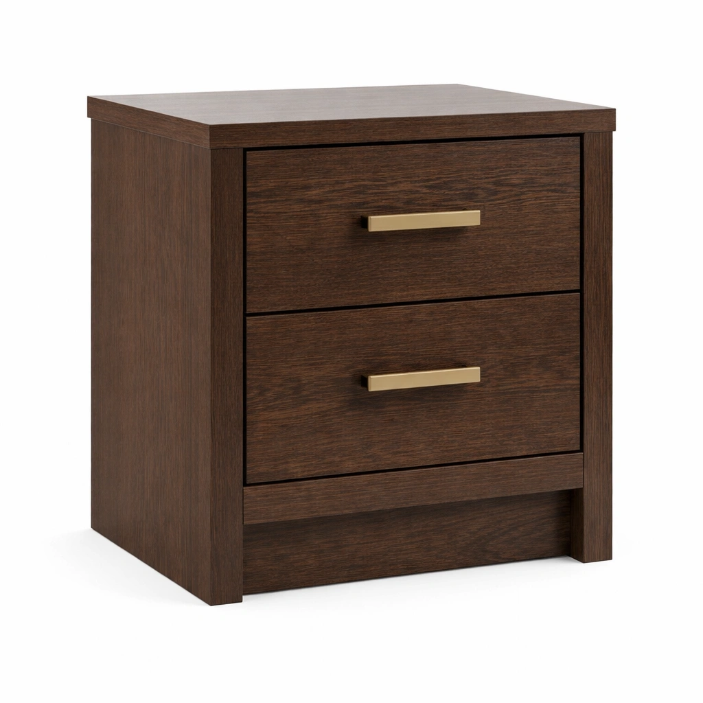 Esta mesita de noche está fabricada con tablero de partículas laminado en color marrón. Sus dimensiones son 40 cm de longitud, 30 cm de anchura y 50 cm de altura. Incluye dos cajones equipados con tiradores metálicos para facilitar su apertura. Su peso es de 12 kg. Para su mantenimiento, se recomienda limpiar con un paño húmedo.